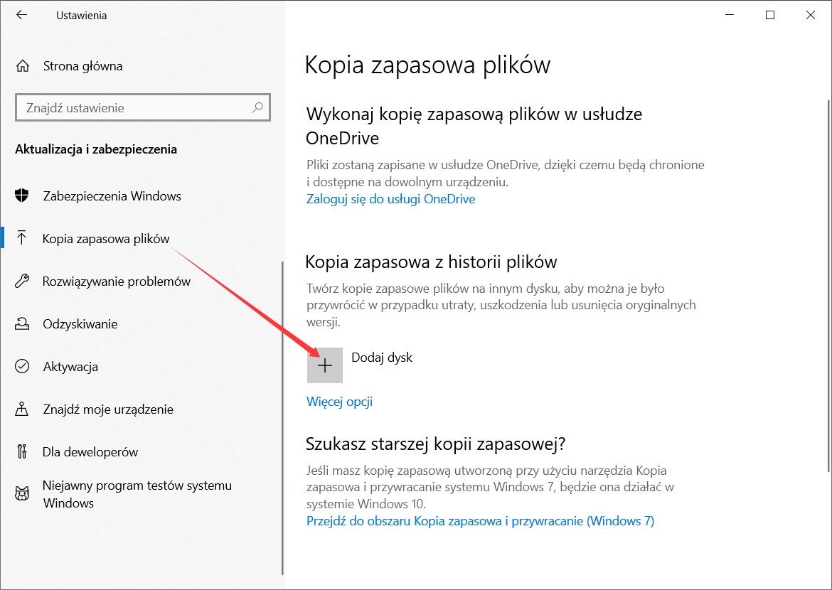 - Przejdź do „Ustawienia” > „Aktualizacje i zabezpieczenia” > „Kopia zapasowa”.