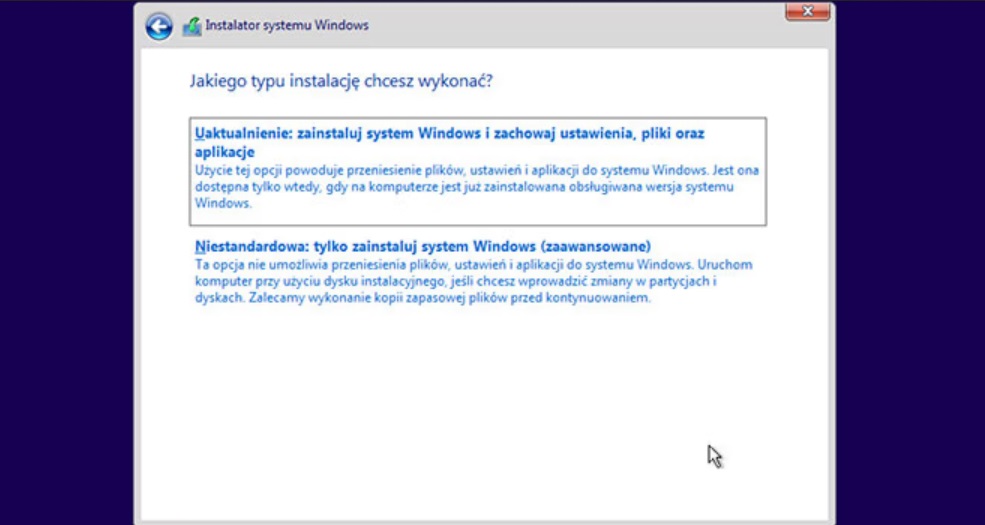 - Wybierz typ instalacji: Możesz wybrać „Uaktualnienie” (jeśli chcesz zachować pliki i programy) lub „Niestandardowa” (jeśli chcesz zainstalować system od nowa). W przypadku „Niestandardowej” wybierz partycję, na której chcesz zainstalować Windows.
