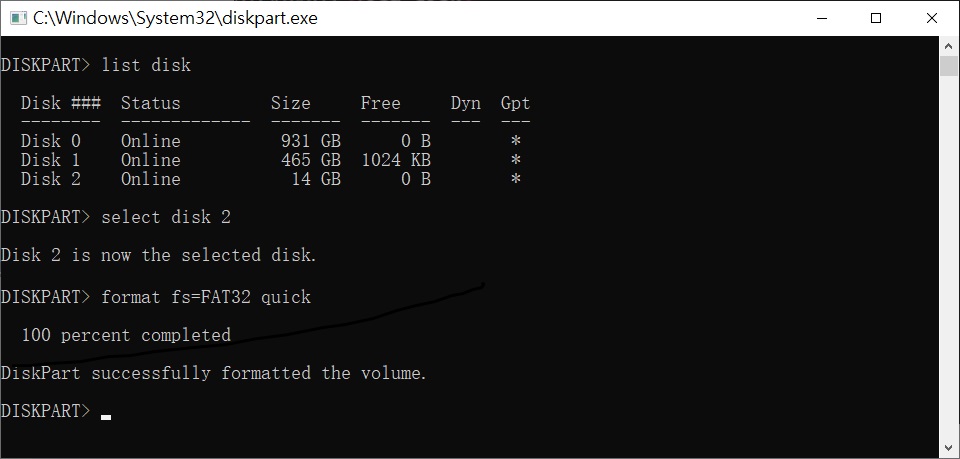 - Wpisz następujące polecenie, aby sformatować dysk z systemem plików FAT32: format fs=FAT32 quick.