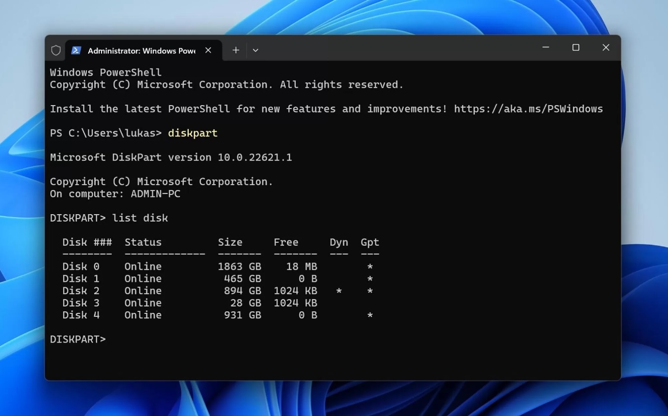 - Wpisz list disk i naciśnij Enter, aby zobaczyć dostępne dyski.