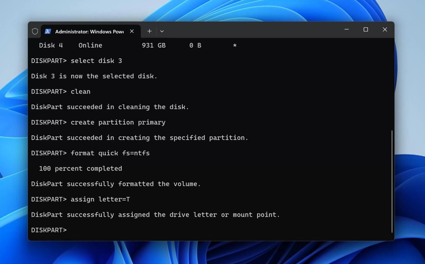 - Wpisz clean i naciśnij Enter, aby usunąć wszystkie partycje na karcie.