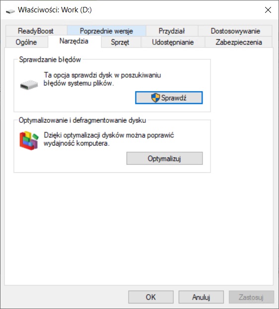 - Na zakładce „Narzędzia” dostępne są dwa główne narzędzia – sprawdzanie błędów i defragmentacja. Kliknij przycisk „Sprawdź”, aby skorzystać z pierwszego narzędzia.