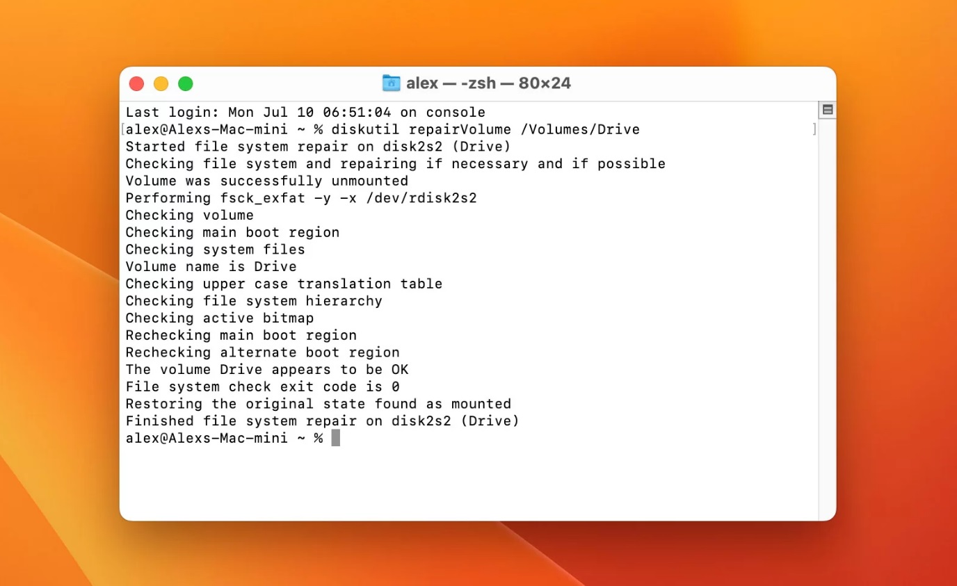 diskutil repairVolume /Volumes/[Nazwa Dysku]
