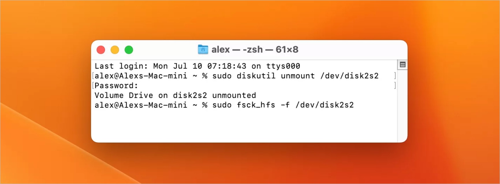 3. Następnie wpisz polecenie sudo fsck_hfs -f /dev/disk1s2. mac-gsck_hfs