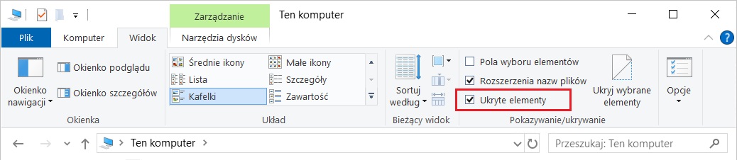 - Z rozwijanego menu wybierz „Pokaż”, a następnie upewnij się, że zaznaczone jest „Ukryte elementy”.