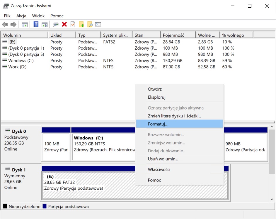 - Kliknij prawym przyciskiem myszy na wolumenie pendrive (lub na nieprzydzielonej przestrzeni) i wybierz „Formatuj”.