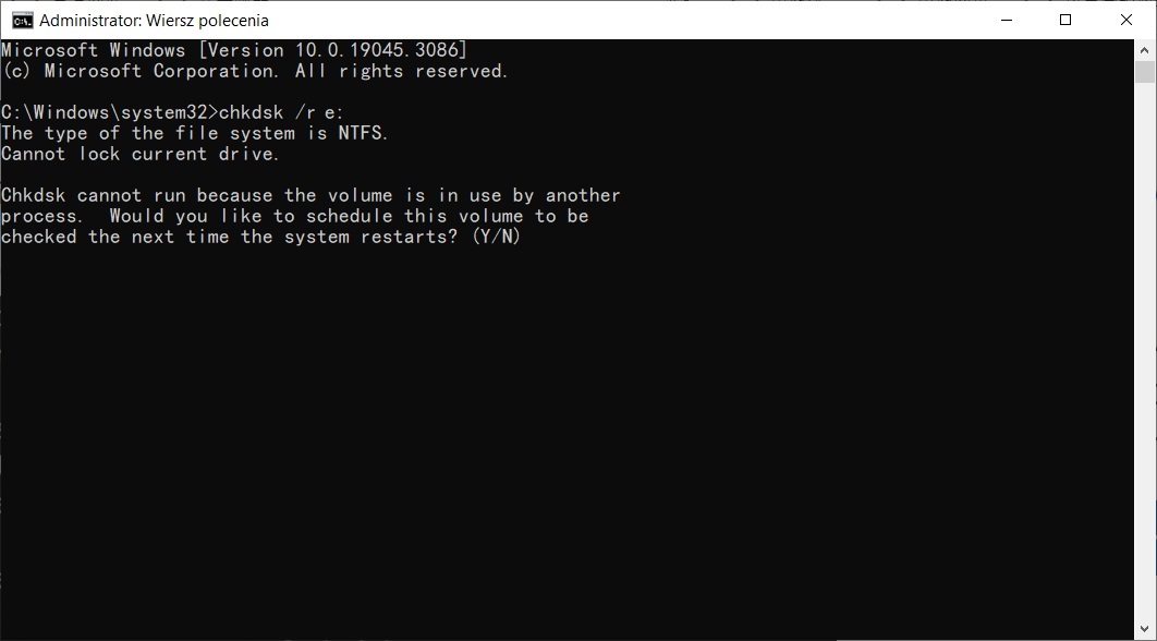 chkdsk e: /r. Zastąp „e” literą dysku przypisaną do partycji RAW.