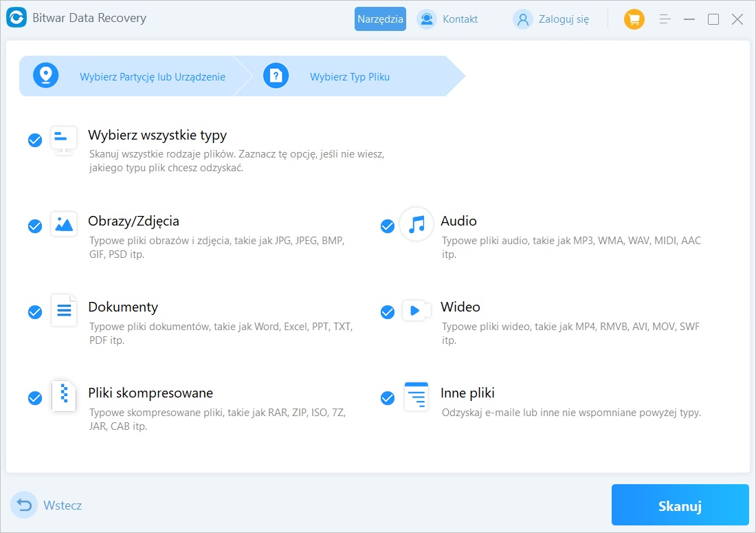 - Wybierz typ plików do odzyskania, a następnie kliknij przycisk „Skanuj”. Typy plików są klasyfikowane jako: obrazy, filmy, dźwięki, dokumenty, pliki skompresowane i inne.