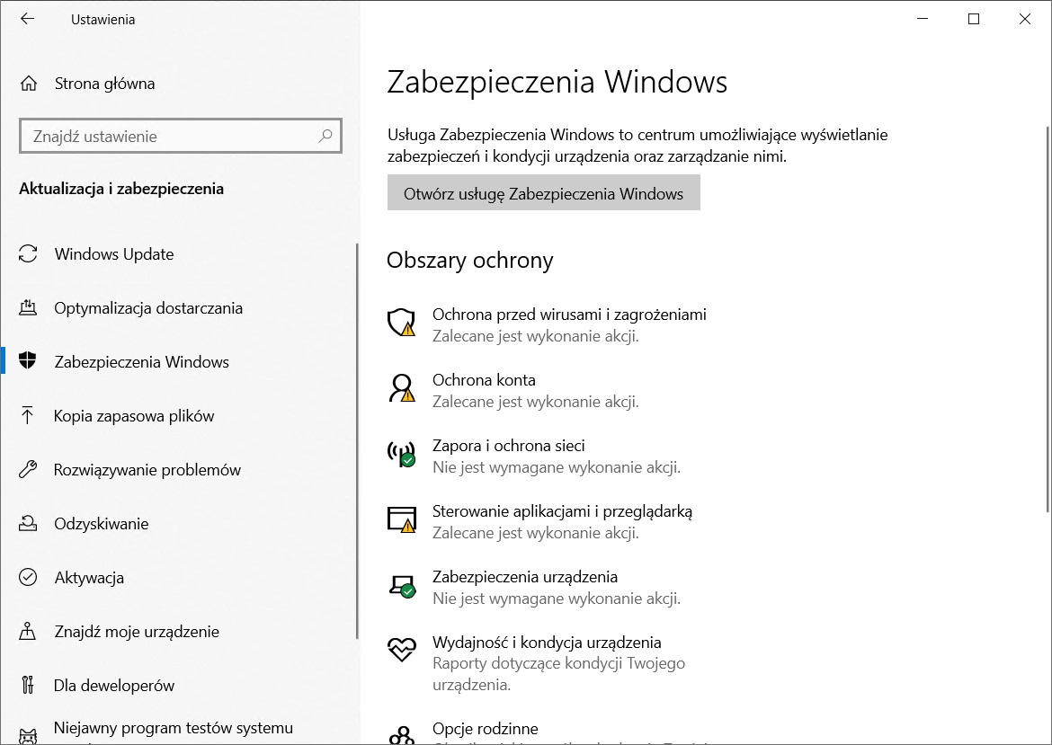 - Kliknij Ustawienia systemu Windows, znajdź „Aktualizacja i zabezpieczenia” – „Zabezpieczenia systemu Windows” – „Ochrona przed wirusami i zagrożeniami” i otwórz je.