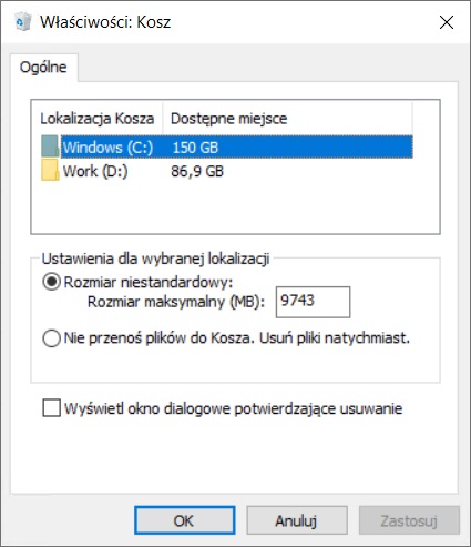 - W ustawieniach dla wybranej lokalizacji wybierz opcję „Dostosowany rozmiar” i skonfiguruj maksymalny rozmiar kosza dla tego dysku.