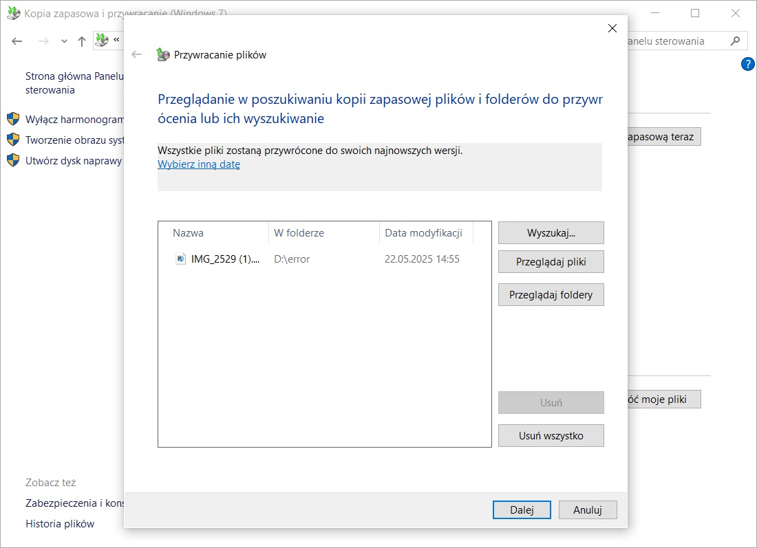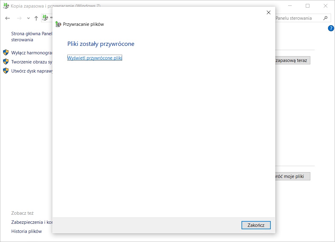 Metoda 2: Użycie funkcji kopii backup & recovery systemu Windows do odzyskania plików