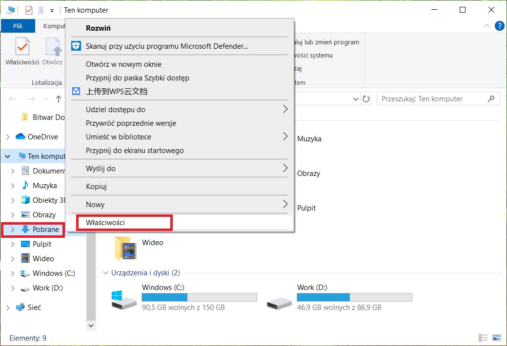 - Następnie, w lewym panelu Eksploratora plików, znajdź folder „Pobrane”. Kliknij go prawym przyciskiem myszy i wybierz „Właściwości”.