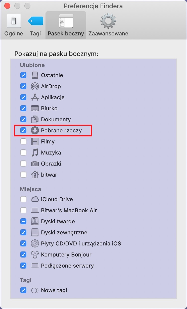 - W sekcji „Ulubione” zaznacz pole wyboru obok opcji „Pobrane rzeczy”.