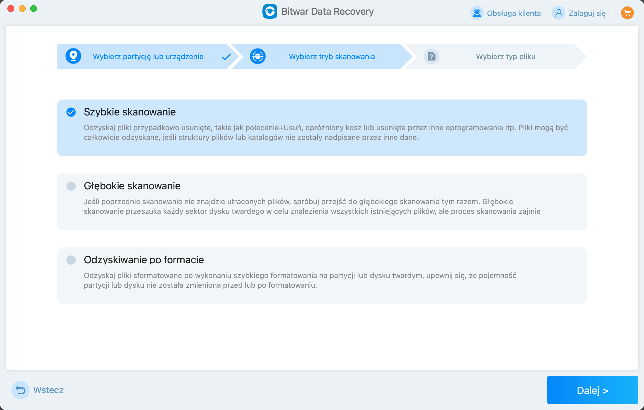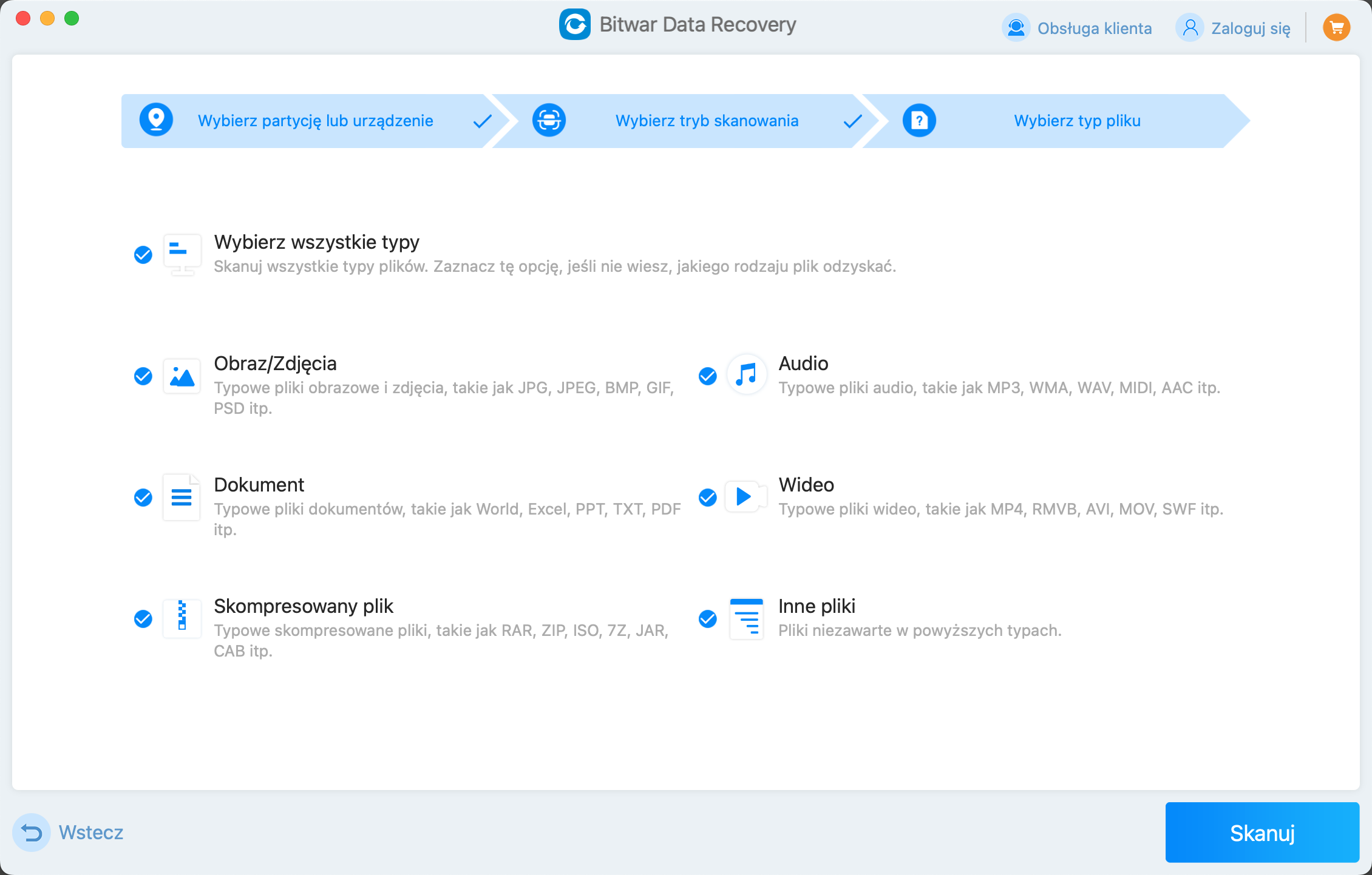 Narzędzie Bitwar Data Recovery umożliwia łatwe odzyskiwanie potrzebnych plików z systemów Mac i Windows w trzech prostych krokach. Nawet jeśli nie jesteś zaznajomiony z obsługą komputera, możesz łatwo odzyskać usunięte, sformatowane lub utracone dane.
